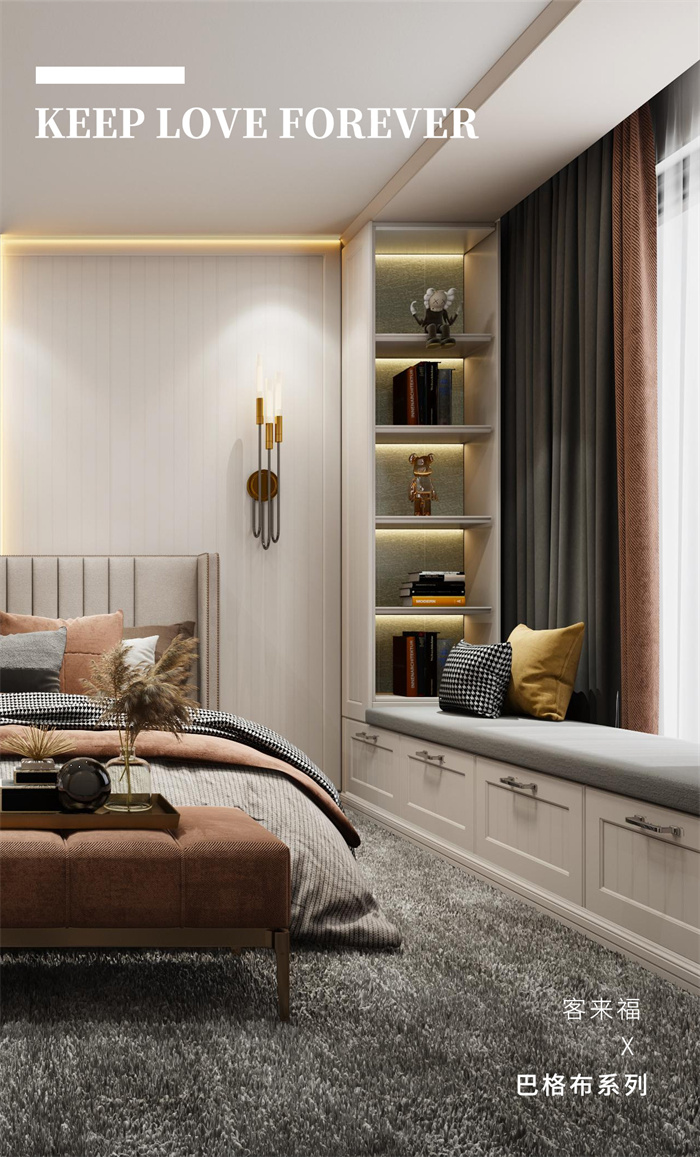 臥室的柵格背景墻和模壓護墻,做出了?定混油的產(chǎn)品效果,超晶板和巖板等超現(xiàn)代感的元素的融入, 更是將簡歐這?經(jīng)典風(fēng)格產(chǎn)品做了顛覆,更符合當(dāng)下消費?群讓客戶生活更加自然。